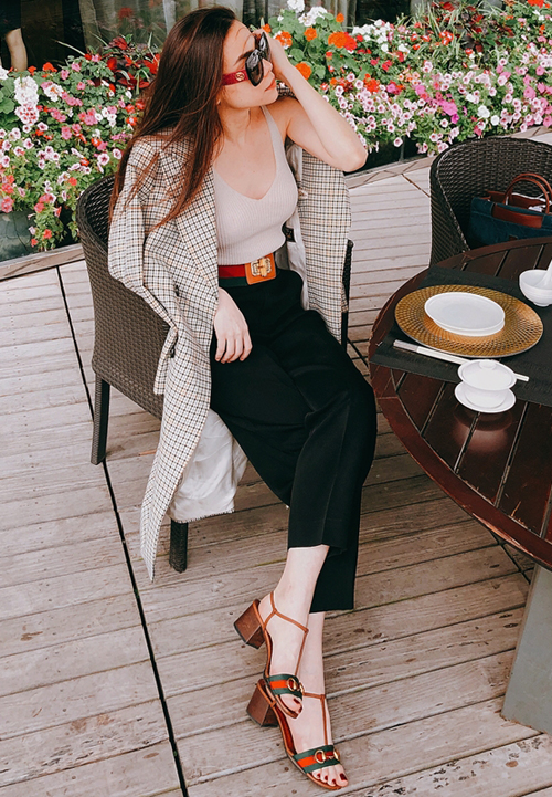 Hòa cùng trào lưu phối đồ với xu hướng họa tiết đa sắc, Cao Thiên Trang giúp mình thanh lịch và trẻ trung khi diện áo cổ trụ, tay bo đi cùng quần kẻ sọc và sandal cao gót trắng. |