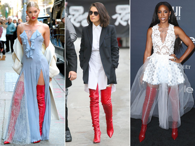 | Boots cổ cao luôn là item được các sao rất ưa chuộng. Thiên thần nội y Elsa Hosk, diễn viên Mila Kunis và Kelly Rowland cùng lăng xê đôi boots đỏ nổi bật của Fendi. Hosk và Rowland gây bất ngờ khi kết hợp boots với đầm xuyên thấu. Từ lợi thế vóc dáng cho đến sự phối màu ăn ý, bộ cánh của chân dài Elsa được nhận xét phong cách hơn. |