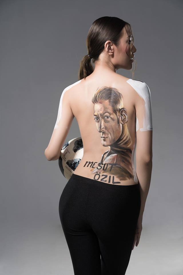 Là fan cuồng của Ozil, Đặng Phạm Phương Chi đã vẽ hình cầu thủ này lên lưng, chụp bộ ảnh bán nude đầy táo bạo nhằm cổ vũ cho chàng tiền vệ.