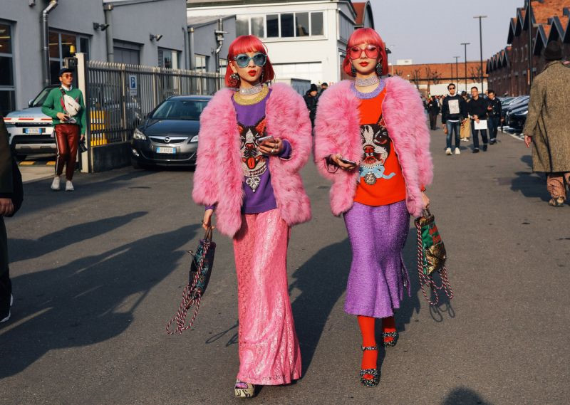 | Ami và Aya Suzuki đều lựa chọn áo khoác lông màu sắc, kết hợp cùng chiếc túi rút dây của Gucci, khi xuất hiện trên đường phố Milan. Mái tóc gam hồng trở thành điểm thu hút trên toàn set đồ. |
