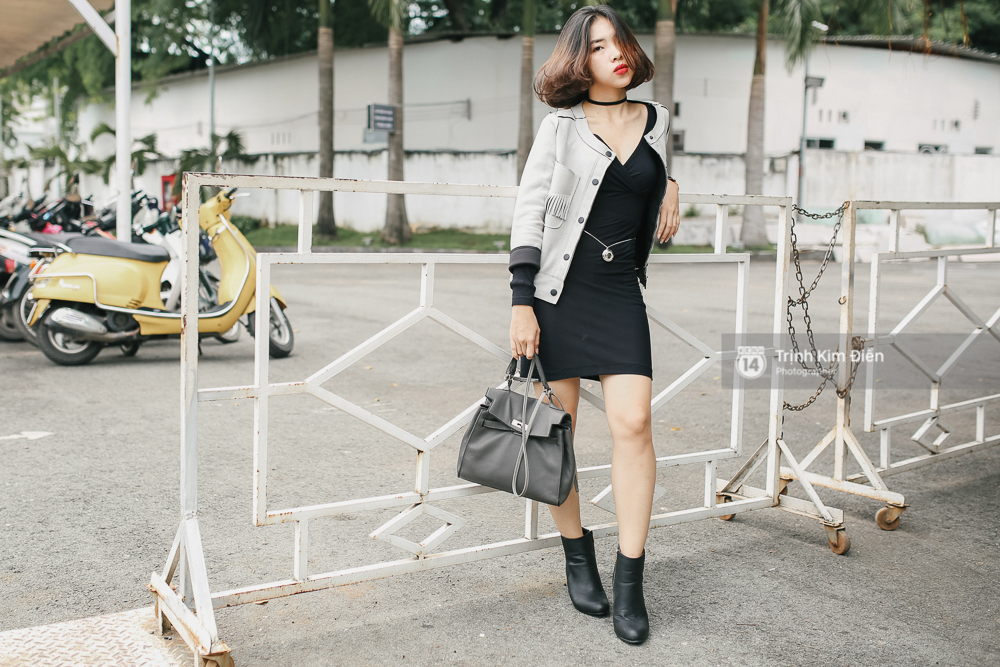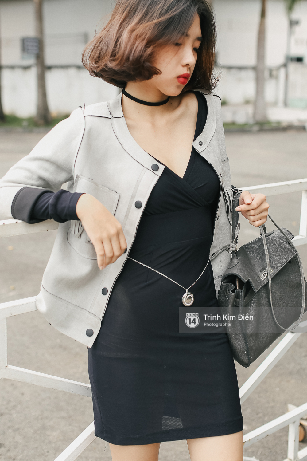 Cô bạn Mai Phương Ngân tăng phong cách cho chiếc váy đen ôm sát với bomber jacket màu ghi cùng túi xách rất ton-sur-ton.