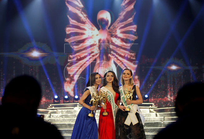 Sân khấu trống trơn phía sau khi Hương Giang nhận lời chúc mừng từ hai tân Á hậu. Ảnh: Epa.