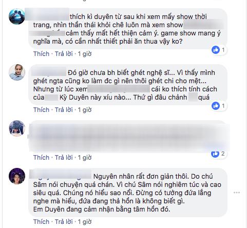 “Tại phẫu thuật thẩm mỹ bị đơ đó, em ấy muốn cười lắm mà cơ mặt không nghe lời”; “Nhìn nét mặt suốt chương trình này của Kỳ Duyên thì hình như cô ấy bị thế lực nào đó ép để tham gia thì phải? Có phải tôi nhạy cảm quá không”….là hàng loạt bình luận từ cư dân mạng.