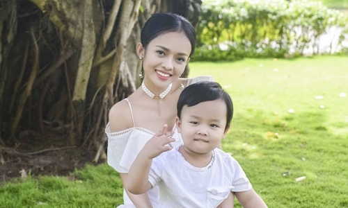 Thanh Trúc dắt con trai hai tuổi dạo công viên