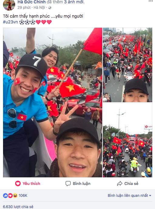 Trên mạng xã hội, Đức Chinh và Duy Mạnh là 2 thành viên đầu tiên của U23 Việt Nam chia sẻ hình ảnh, cảm xúc khi nhận được sự chào đón của người dân tại sân bay Nội Bài và trên đường phố Hà Nội. Những hình ảnh này nhanh chóng được cộng đồng mạng chia sẻ, tăng đến trăm ngàn lượt cảm xúc chỉ trong 1-2 giờ đồng hồ.