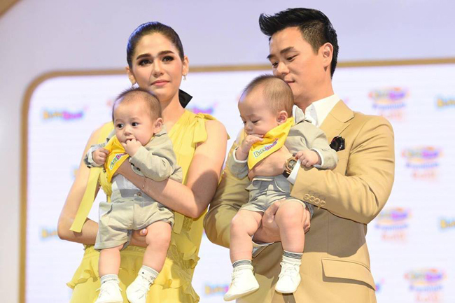 Hai bé yêu của Chompoo Araya được bố mẹ đưa tới tham dự một sự kiện giới thiệu sản phẩm mới hôm đầu tuần. Chào đời tháng 9 năm ngoái, Thunder và Storm đã 6 tháng tuổi và được nhiều thương hiệu dành cho trẻ em mời làm gương mặt đại diện.