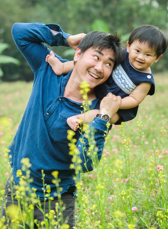 Đạo diễn Việt Kiều James Ngô chọn trang phục cùng tông xanh với con trai.