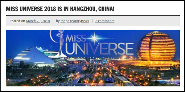 Mới đây, một số trang tin và diễn đàn sắc đẹp quốc tế đăng tải thông tin “Cuộc thi Hoa hậu Hoàn vũ Thế giới 2018 sẽ được tổ chức tại Trung Quốc”. Kèm theo nội dung này là hình ảnh chủ tịch của Tổ chức Hoa hậu Hoàn vũ – bà Paula Shugart đang trao đổi với đối tác cũng như chính quyền tại thành phố Hàng Châu, tỉnh Chiết Giang.