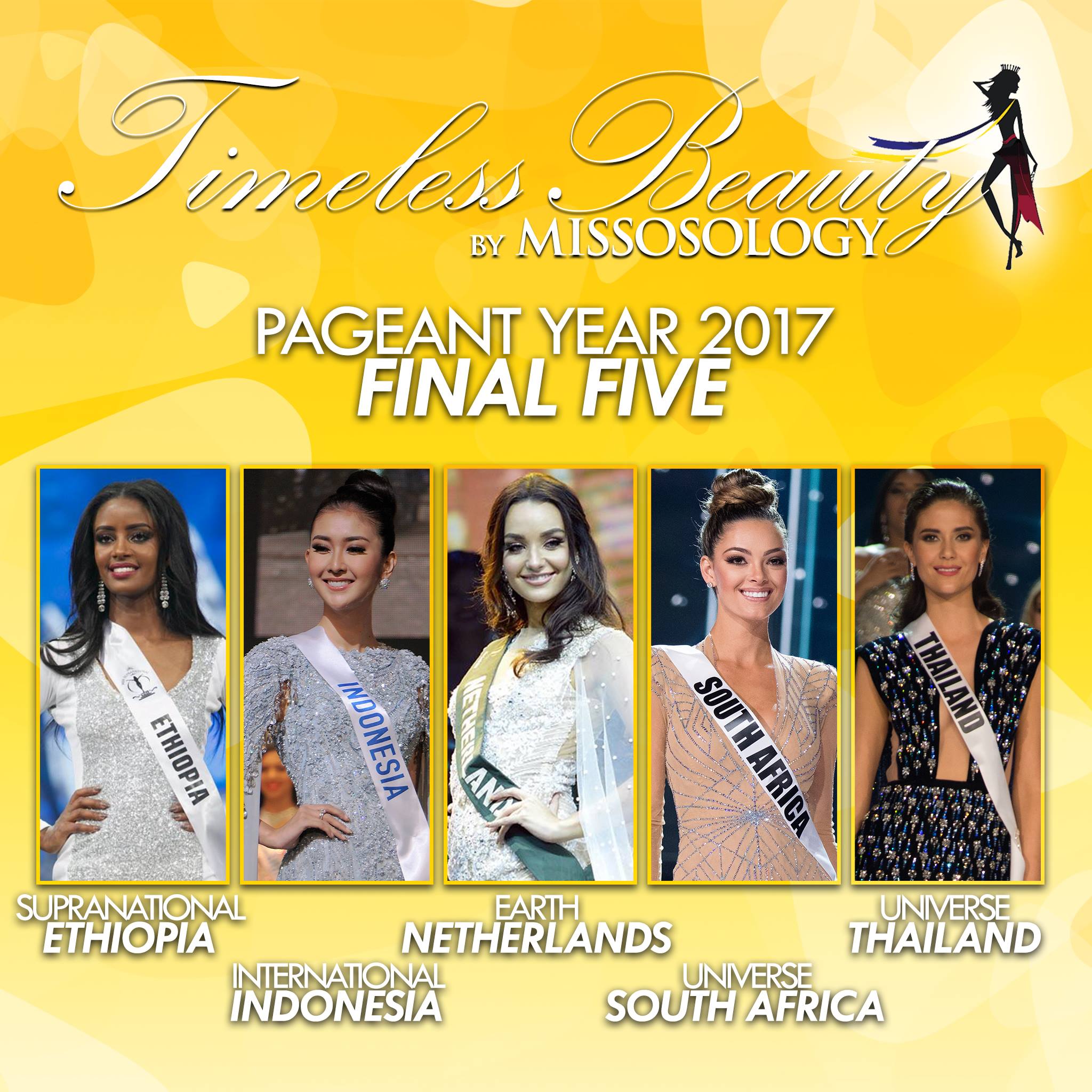 Sau khi công bố top 10, mới đây chuyên trang sắc đẹp Missosology chính thức công bố danh sách top 5 hoa hậu đẹp nhất thế giới. 5 cô gái này đã vượt qua gần 100 ứng cử viên sáng để bước vào chặng đua cuối cùng tranh danh hiệu Timeless Beauty – Vẻ đẹp vượt thời gian 2017.