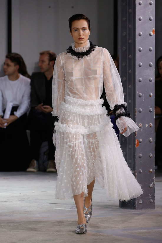 Bốn tuần lễ thời trang lớn nhất thế giới dành cho mùa mốt Thu Đông 2018 diễn ra trong hơn một tháng qua. Trên sàn diễn, nhiều thiết kế xuyên thấu táo bạo, cắt xẻ mạnh tay và mốt ngực trần tiếp tục được các nhà mốt lăng xê. Đây cũng là một trong những xu hướng nổi trội của Xuân Hè 2018. Trong ảnh là một thiết kế của Anaïs Jourden.