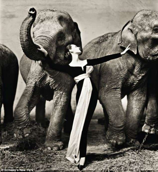 Bức “Dovima và những chú voi, đầm dự tiệc của Dior, gánh xiếc Cirque D’Hiver, Paris” được chụp bởi nhiếp ảnh gia người Mỹ Richard Avedon. Bức ảnh được kỳ vọng đạt mức giá từ 300.000 USD – 500.000 USD (tương đương từ 6,8 tỷ đồng – 11,3 tỷ đồng).