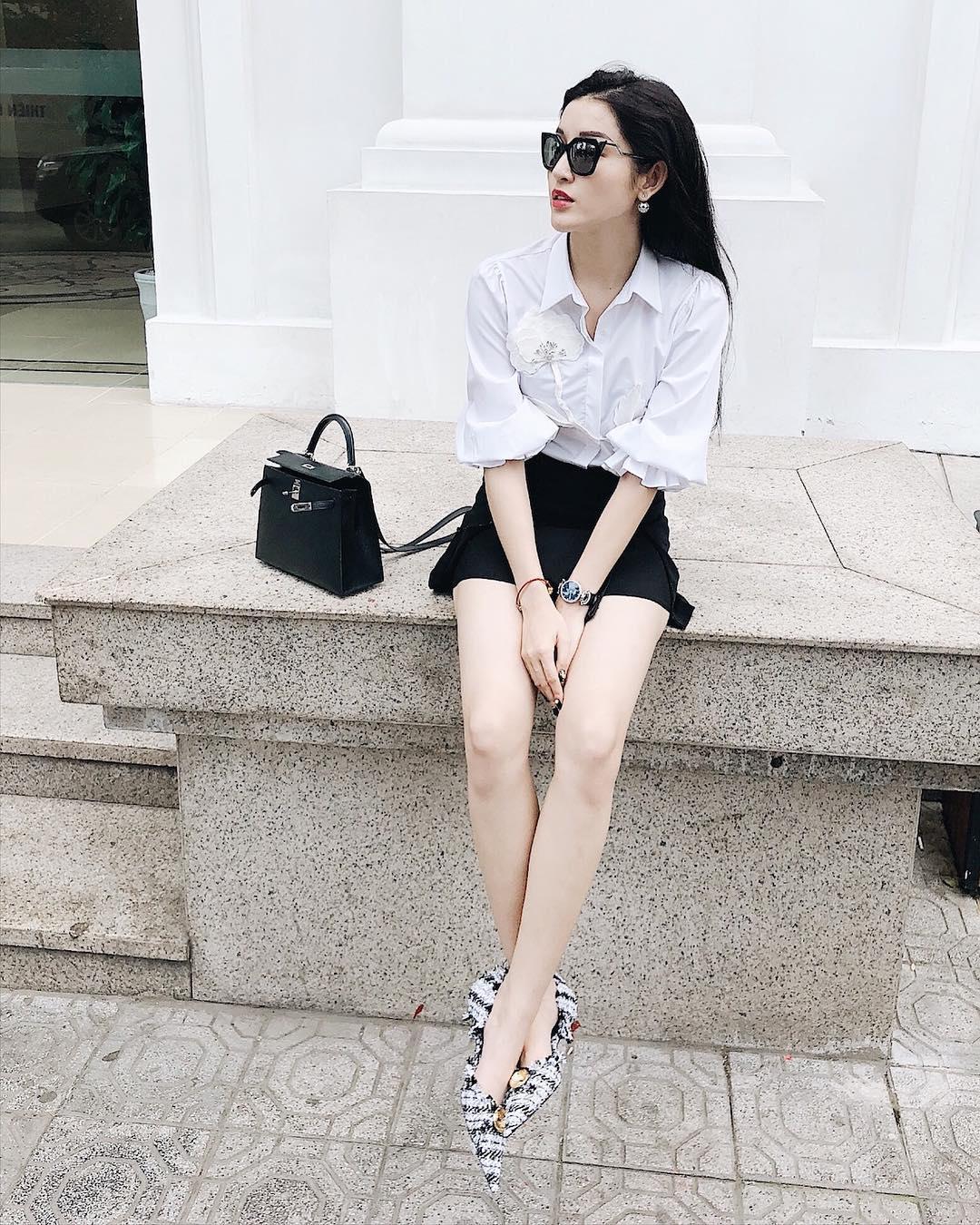 Á hậu Huyền My với trang phục áo sơ mi váy đen như nữ sinh xuống phố