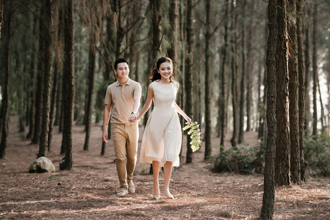 Trước giờ lên xe hoa, Tố Như chia sẻ bộ ảnh cưới của vợ chồng cô được thực hiện ở rừng thông yên bình. Cặp đôi mặc trang phục đồng điệu, cùng nắm tay dạo bước trong rừng như thuở mới hẹn hò.