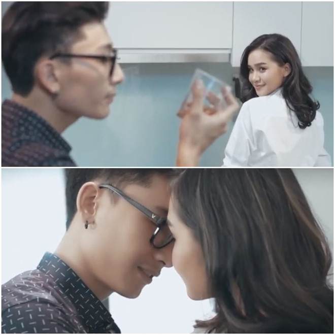 Trước cảnh nóng này, Lê Thu Trang cũng xuất hiện ở phần trước của đoạn video, cô nói đoạn thoại: “Nấu ăn cho anh ta, anh nghĩ sao?”. Trên bắp tay cô cũng in hình xăm giả khá lớn.