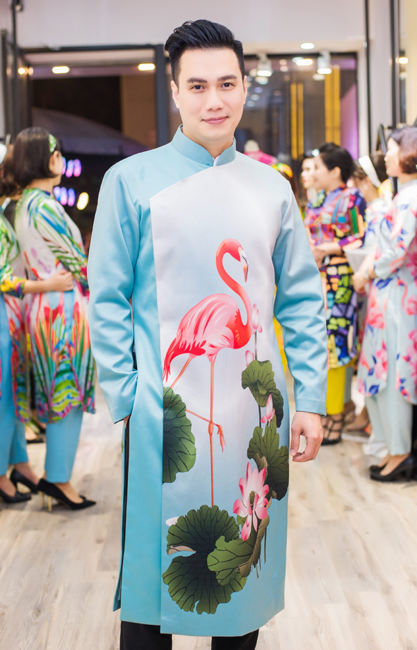 Việt Anh mặc áo dài đến sự kiện của nhà thiết kế Ly Eva và Hà Minh Phúc. Thiết kế cách tân mang điểm nhấn hình chim hạc tông xanh và hồng.